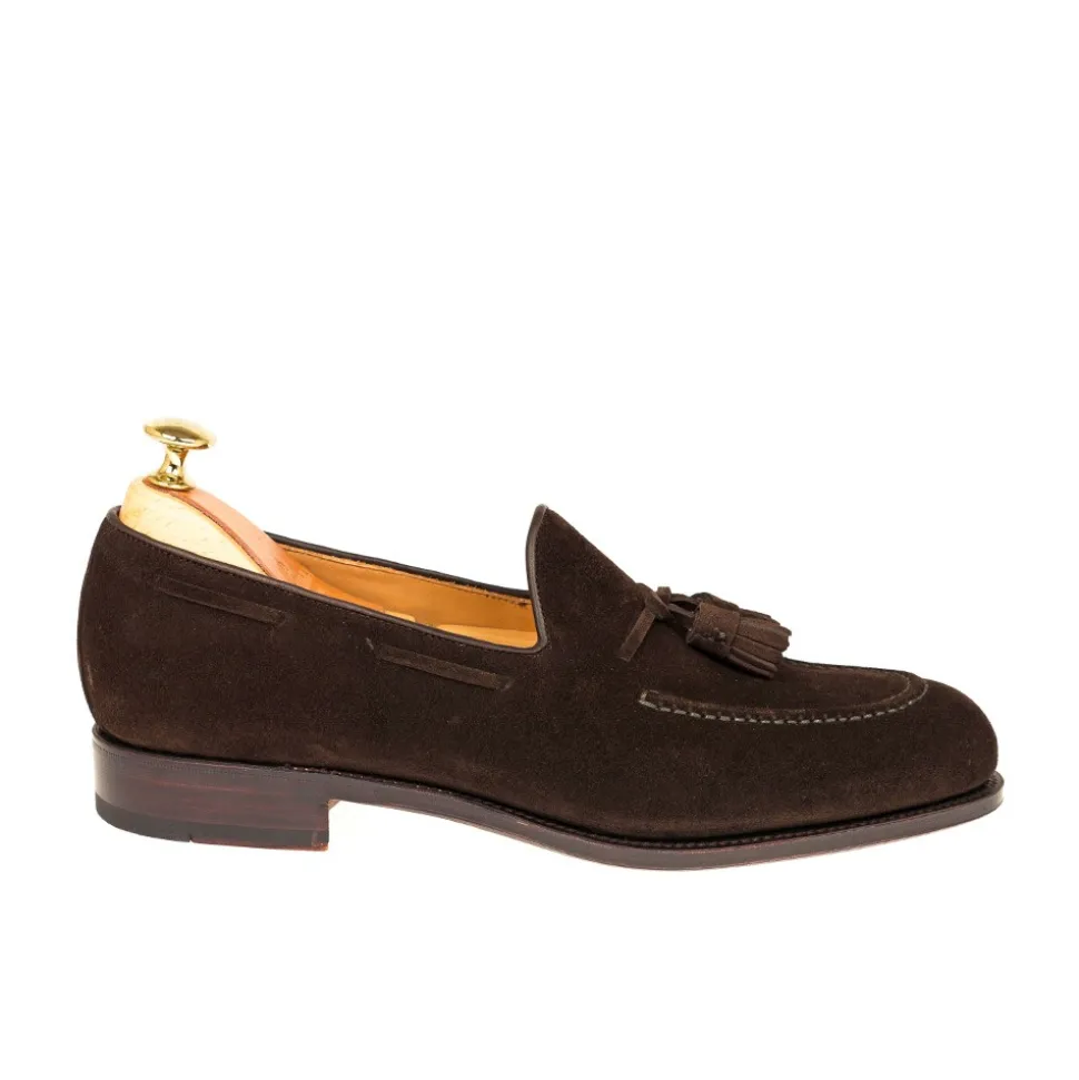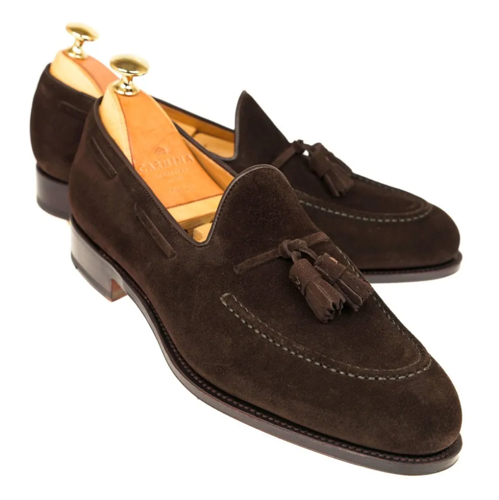 Mocasines de hombre con borlas en ante de color marrón.Acabado con una suela de cuero y forro de becerro.Este zapato, al igual que todos los Carmina, está manufacturado cuidadosamente por artesanos expertos y sigue las mismas técnicas que Charles Goodyear concibió en 1869.Para este estilo hemos elegido la horma Forest, una de las hormas más antiguas de la casa. Redondeada en la punta, con empeine normal y generosa de espacio en la parte delantera.