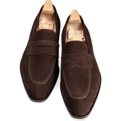 Mocasines de hombre con antifaz en ante de becerro marrón. Acabado con suela simple de cuero y forro de becerro.Este zapato al igual que todos los Carmina está manufacturado cuidadosamente por artesanos expertos y siguiendo las mismas técnicas que Charles Goodyear concibió en el año 1869 Para este estilo hemos elegido la estilizada horma Simpson , una de nuestras hormas de calce estrecho , recomendamos subir media talla en comparación con las demás hormas a excepción de la horma Alcudia que también tiene calce estrecho.