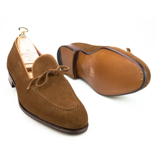 Mocasines de hombre con lazo en ante snuff. Acabado sobre una suela de cuero y forro de becerro. Este zapato al igual que todos los Carmina está manufacturado cuidadosamente por artesanos expertos y siguiendo las mismas técnicas que Charles Goodyear concibió en el año 1869. Para este modelo hemos elegido la horma Uetam. Horma de inspiración italiana especialmente diseñada para zapatos sin cordones. Baja en empeine y calce estrecho para una mejor sujeción del pie.