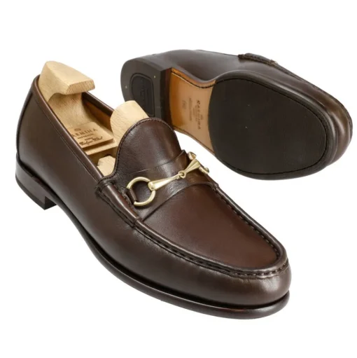 Mocasines horsebit en rusticalf marrón.Acabado sobre una suela Tomir con una fina capa de goma en la suela de cuero y forro de becerro.Este zapato está manufacturado cuidadosamente por artesanos expertos en Cosido Blake.Montados sobre la horma xim, una horma redondeada e intemporal diseñada para Kiowas, con un ajuste regular en el área del empeine y la puntera.