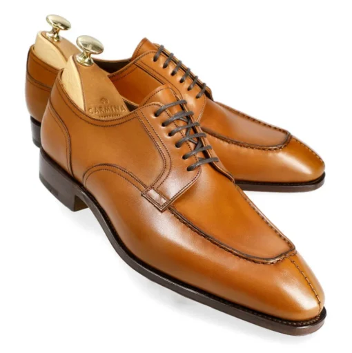 Blucher noruego de seis ojetes en becerro color Cognac de Tannerie D’Anonnay. Este modelo presenta suela simple de cuero con los canto cuero claro y forro 100% de becerro. Este zapato al igual que todos los Carmina está manufacturado cuidadosamente por artesanos expertos y siguiendo las mismas técnicas que Charles Goodyear concibió en el año 1869 .Para este estilo hemos elegido la estilizada horma Simpson . Una de nuestras hormas de calce estrecho D. Recomendamos subir media talla en comparación con las demás hormas de calce EE.
