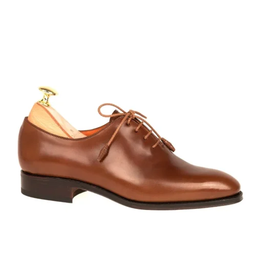 Zapatos en cordovan de mujer enterizo inglés en color bourbon.Con suela de piel, tacón de 20 mm y con forro de cabra.En construcción Goodyear Welted.Modelo montado en Hills. Horma de calce más bien estrecho con empeine bajo para una mayor sujeción del pie. Se caracteriza también por una punta semi cuadrada, lo que la hace ideal para modelos tanto elegantes como semi-sport.