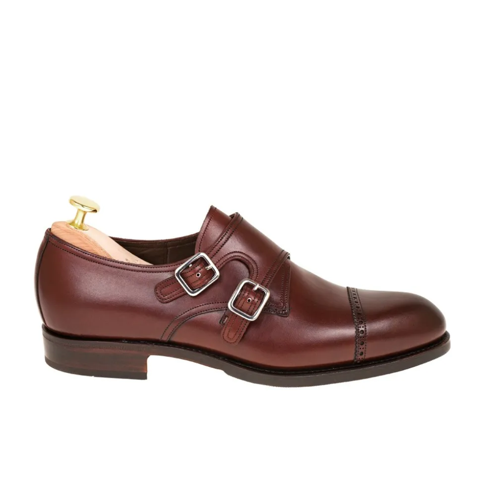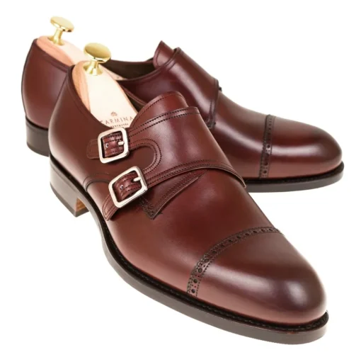 Zapatos de doble hebilla con puntera recta en vegano burdeos. Este zapato esta trapado y festoneado.Acabada con nuestra suela de goma Tomir y forro cien por cien becerro.Este zapato al igual que todos los Carmina está manufacturado cuidadosamente por artesanos expertos y siguiendo las mismas técnicas que Charles Goodyear concibió en el año 1869.Para este estilo hemos elegido la horma Robert, una de las hormas más antiguas de la casa. Redondeada en la punta, con empeine normal y generosa de espacio en la parte delantera.