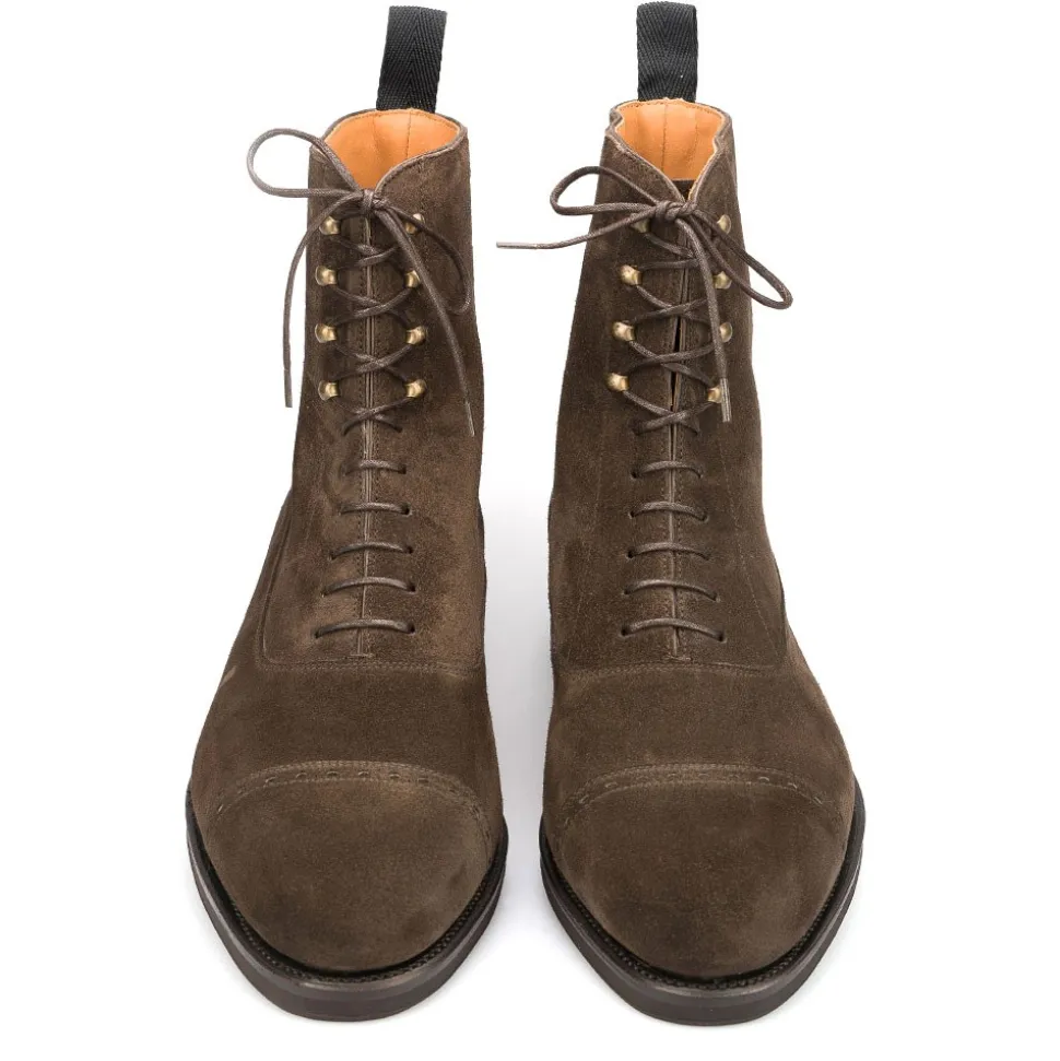 Bota caña alta estilo Balmoral en ante de Becerro marrón.Acabadas sobre una suela de goma y forro de becerro.Este zapato al igual que todos los Carmina está manufacturado cuidadosamente por artesanos expertos y siguiendo las mismas técnicas que Charles Goodyear concibió en el año 1869.Para este estilo hemos elegido la horma Forest, una de las hormas más antiguas de la casa. Redondeada en la punta, con empeine normal y generosa de espacio en la parte delantera.