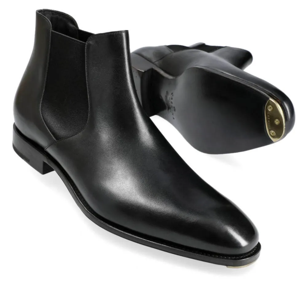 Botas Chelsea en Box Calf Negro.Acabadas en suela de cuero y con puntera de latón.Este zapato al igual que todos los Carmina está manufacturado cuidadosamente por artesanos expertos y siguiendo las mismas técnicas que Charles Goodyear concibió en el año 1869.Para este modelo hemos elegido la horma Rain, por su versatilidad en estilo, ya que funciona perfectamente como zapato elegante y a la vez semisport. La Rain es un horma bien proporcionada con buen calce tanto en empeine como en punta.