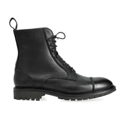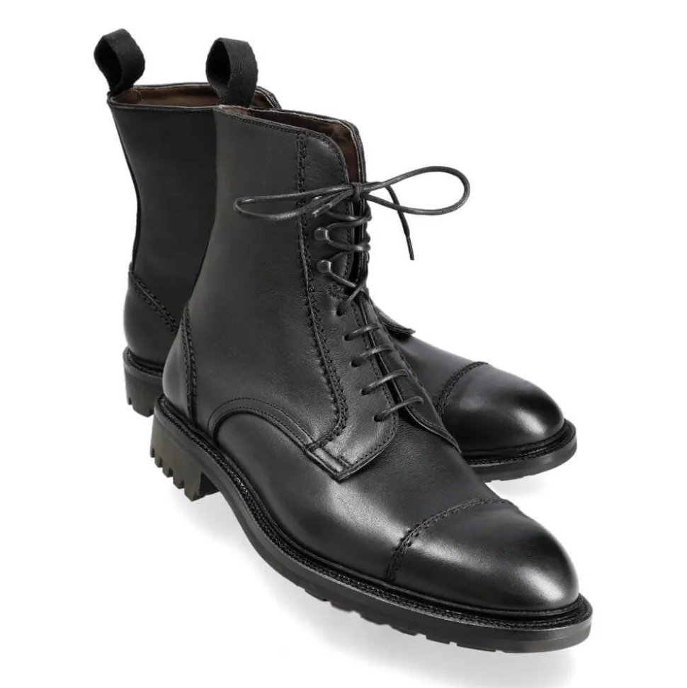 Botas militares de edición limitada en cuero Montblanc color negro.Acabado con suela de gona Comando y forro de becerro.En construcción Goodyear Welted. Este zapato, como todos los Carmina, está manufacturado cuidadosamente por artesanos expertos, los cuales siguen las mismas técnicas que Charles Goodyear concibió en 1869.Modelo montado en la horma Oscar. Redondeada de punta y empeine bajo y calce normal. Oscar es robusto y clásico, con una puntera sutilmente redondeada y ancho en el área delantera.