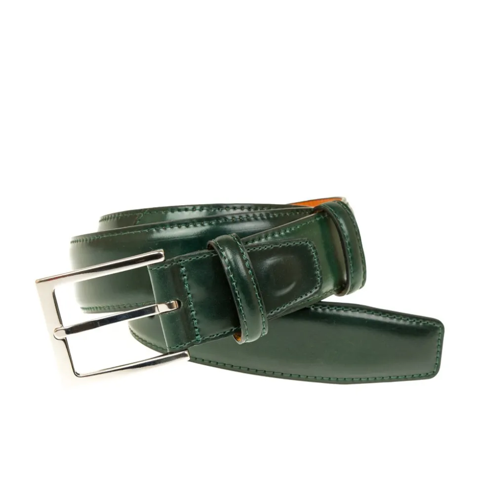 Clásico cinturón 35mm en Horween shell Cordovan color verde. En Carmina usamos las mismas pieles en los zapatos que para nuestros cinturones y los acabamos con una capa de cera para asegurar una patina que ira embelleciéndose con el uso y el roce. Este cinturón va con piel de becerro y los acabamos con una hebilla de latón cubierta con Niquel para un brillo perfecto.La longitud del cinturón se mide desde el agujero central hasta el final hebilla. Por favor tome medidas de su cintura con pantalones y añada unos centímetros (3-5cm) para conocer su talla de cinturón.