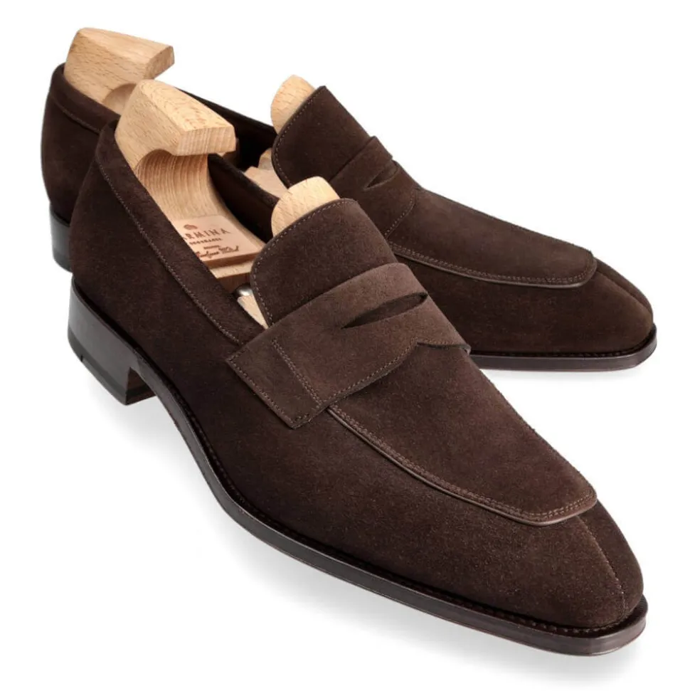 Mocasines de hombre con antifaz en ante de becerro marrón. Acabado con suela simple de cuero y forro de becerro.Este zapato al igual que todos los Carmina está manufacturado cuidadosamente por artesanos expertos y siguiendo las mismas técnicas que Charles Goodyear concibió en el año 1869 Para este estilo hemos elegido la estilizada horma Simpson , una de nuestras hormas de calce estrecho , recomendamos subir media talla en comparación con las demás hormas a excepción de la horma Alcudia que también tiene calce estrecho.