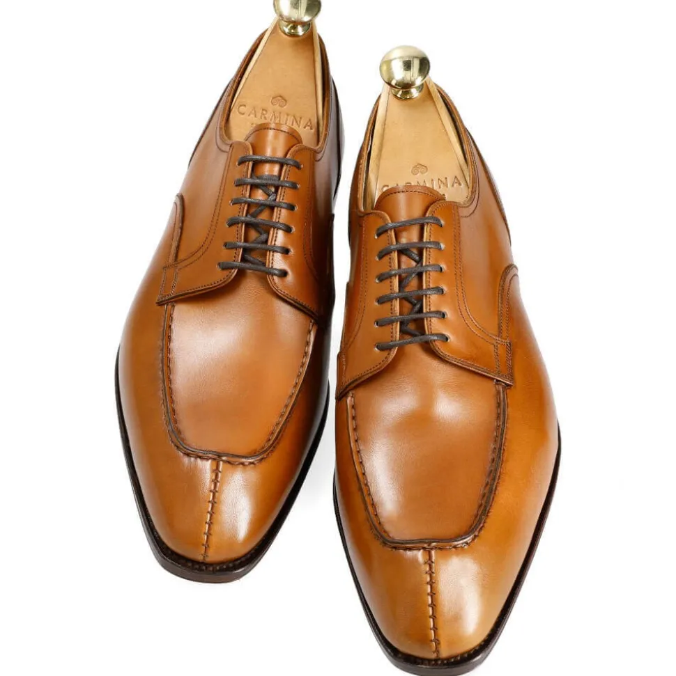 Blucher noruego de seis ojetes en becerro color Cognac de Tannerie D’Anonnay. Este modelo presenta suela simple de cuero con los canto cuero claro y forro 100% de becerro. Este zapato al igual que todos los Carmina está manufacturado cuidadosamente por artesanos expertos y siguiendo las mismas técnicas que Charles Goodyear concibió en el año 1869 .Para este estilo hemos elegido la estilizada horma Simpson . Una de nuestras hormas de calce estrecho D. Recomendamos subir media talla en comparación con las demás hormas de calce EE.