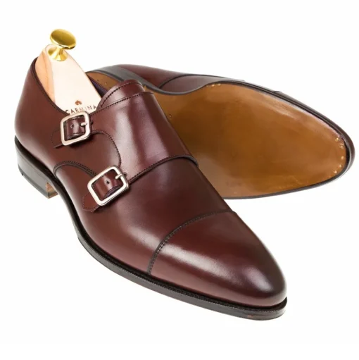 Zapatos de doble hebilla con puntera recta en piel de becerro color burdeos.Acabado con suela de cuero y forro de becerro.Este zapato al igual que todos los Carmina está manufacturado cuidadosamente por artesanos expertos y siguiendo las mismas técnicas que Charles Goodyear concibió en el año 1869.Para este modelo hemos elegido la horma Inca. Horma clásica y elegante, de aspecto alargado con la punta fina y semiredonda.