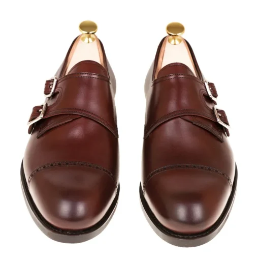 Zapatos de doble hebilla con puntera recta en vegano burdeos. Este zapato esta trapado y festoneado.Acabada con nuestra suela de goma Tomir y forro cien por cien becerro.Este zapato al igual que todos los Carmina está manufacturado cuidadosamente por artesanos expertos y siguiendo las mismas técnicas que Charles Goodyear concibió en el año 1869.Para este estilo hemos elegido la horma Robert, una de las hormas más antiguas de la casa. Redondeada en la punta, con empeine normal y generosa de espacio en la parte delantera.